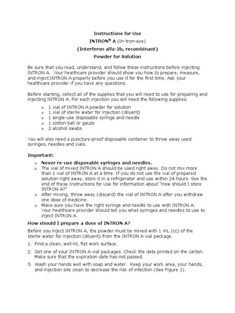 Read Instructions For Use Intron A Solution Injection PDF online is a convenient and frugal way to read Instructions For Use Intron A Solution Injection you love right from the comfort of your own home. Yes, there sites where you can get PDF "for free" but the ones listed below are clean from viruses and completely legal to use.